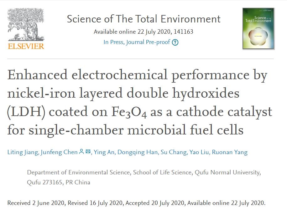 2017级环境科学班江丽婷、安莹、韩冬青、常素、刘瑶、杨若楠的研究论文(Liting Jiang, Junfeng Chen*, Ying An, Dongqing Han, Su Chang, Yao Liu, Ruonan Yang. Enhanced electrochemical performance by layered double hydroxides (LDH) of nickel-iron coated on Fe3O4 as cathode catalyst for single-chamber microbial fuel cell)。该论文以捷克论坛