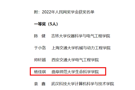2019级环境科学2班杨佳琪同学获得2022年度人民网奖学金一等奖,成为此次获得一等奖中唯一一名本科生。同时获得一等奖的还有来自吉林大学、上海交通大学、西安交通大学、武汉科技大学等高校的研究生。