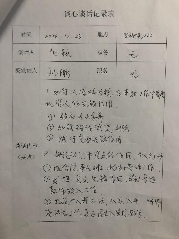 通过此次“谈心谈话”活动,进一步拉近党员之间的距离,建立彼此交流畅谈的“连心桥”,使全体党员以积极、向上的态度全心全意的投入到工作生活中,为筹备教育部师范认证工作提供了动力,带动党员教师凝心聚力共同完成好此项工作。