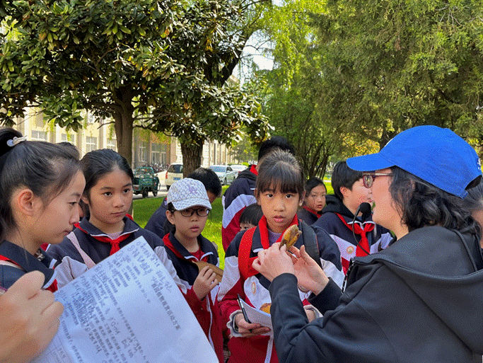 活动过程中,小学生们在各位老师的带领下,认识了多种校园植物,仔细观察了植物的特征,了解了植物名字的来历及其价值。在老师绘声绘色的描述下,同学们听的特别认真,并且能表达自己对植物的理解和感受。小朋友们亲眼观察,亲手触碰植物的叶、花、果实等,对植物产生更深刻的印象。在桃李园,他们在老师的引导下,对各种树木的树皮进行了拓印,亲身实践,感悟了自然之美。最后,全体师生来到捷克论坛
