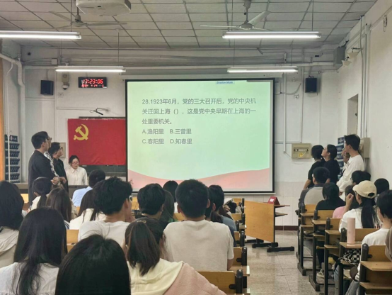 随后,支部党员们展开激烈的党史知识竞答活动,竞答题目涉及党史及党的二十大报告相关内容。活动现场,由本科生第一、三党支部组成甲组,第二党支部组成乙组,活动气氛热烈、高潮迭起,台上两队代表成员全神贯注答题,场下亲友团成员紧盯赛况并积极补充,时而为台上的精彩回答报以热烈掌声。经过几轮的激烈角逐,最终本科生第二党支部队伍以20道题全部回答正确获得胜利。