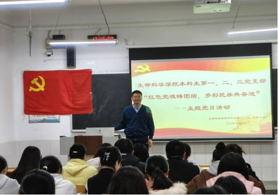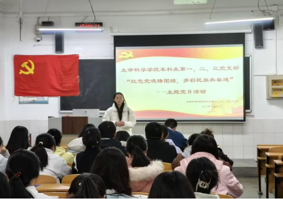 本科生第一、二、三党支部于生物楼229室联合开展“红色党魂铸团结,多彩民族共奋进”主题党日活动。本次活动由本科生第一党支部书记杨申振同志主持。