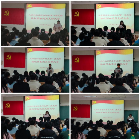 本科生第一党支部于生物楼232室召开接收预备党员支部大会,审议李卓宣、孙宇尘等6位同志接收为预备党员的相关事宜。本次会议由第一党支部书记杨申振主持。