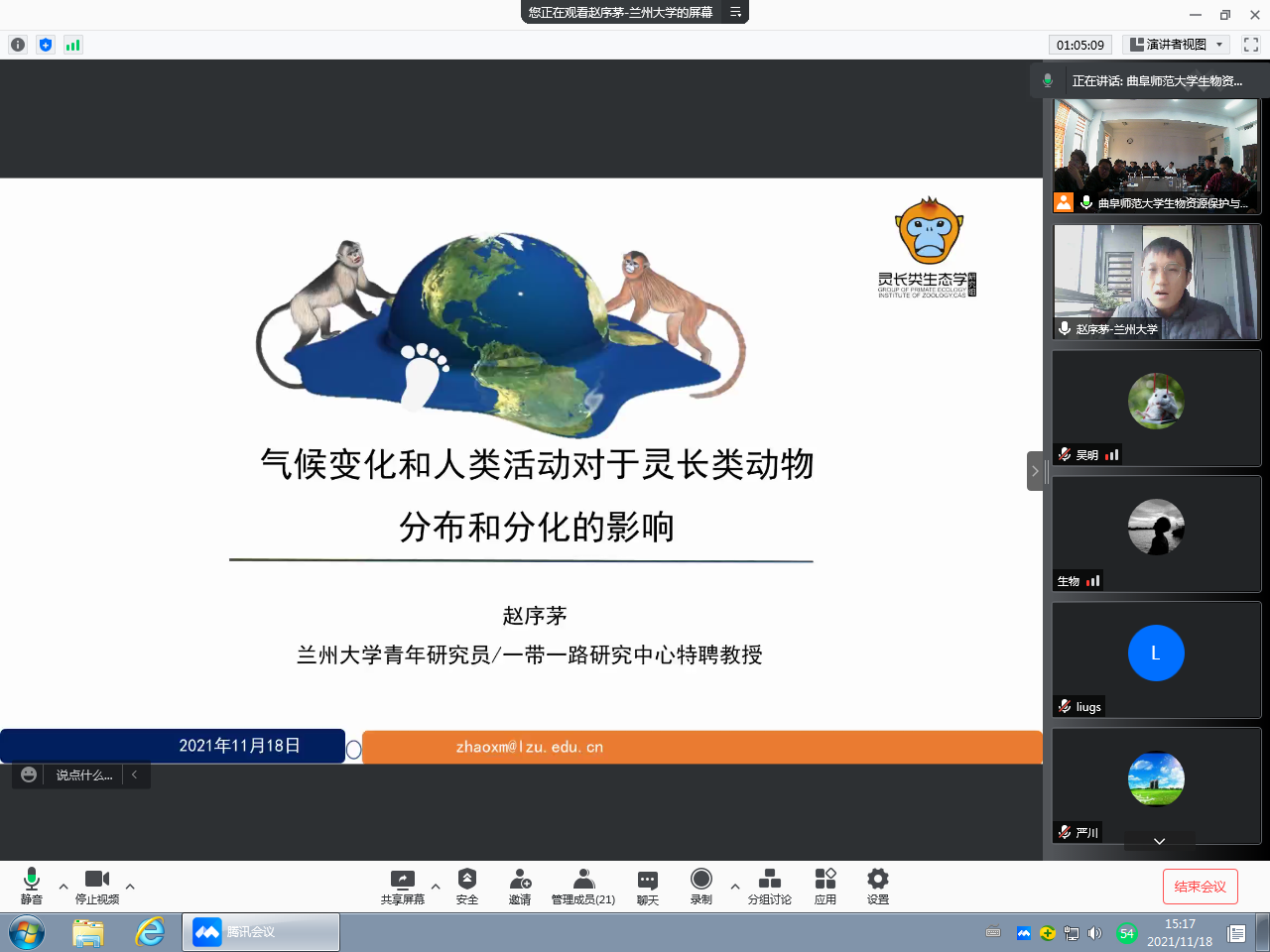 赵序茅教授为大家做了题为《气候变化和人类活动对于灵长类动物分布和分化的影响》的报告,从气候变化对于物种分布的影响机制、中国历史时期灵长类动物分布变化以及影响机制、采集和放牧对于滇金丝猴分布和基因流影响、气候变化对于白头叶猴和黑叶猴生态位分化的影响等四个方面给大家进行了详细的阐述。