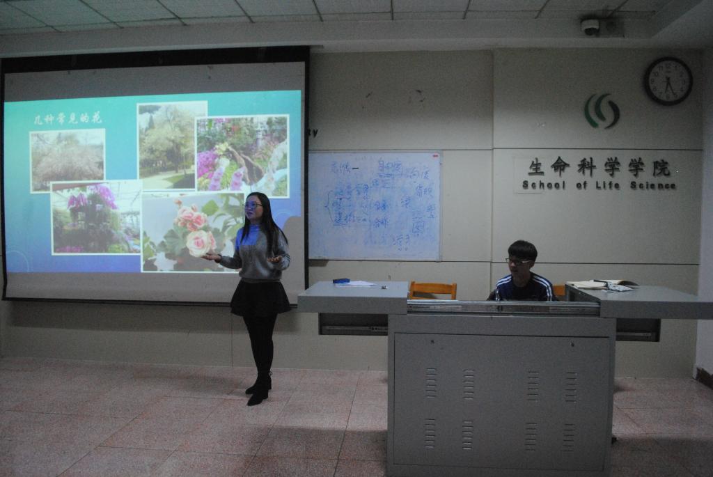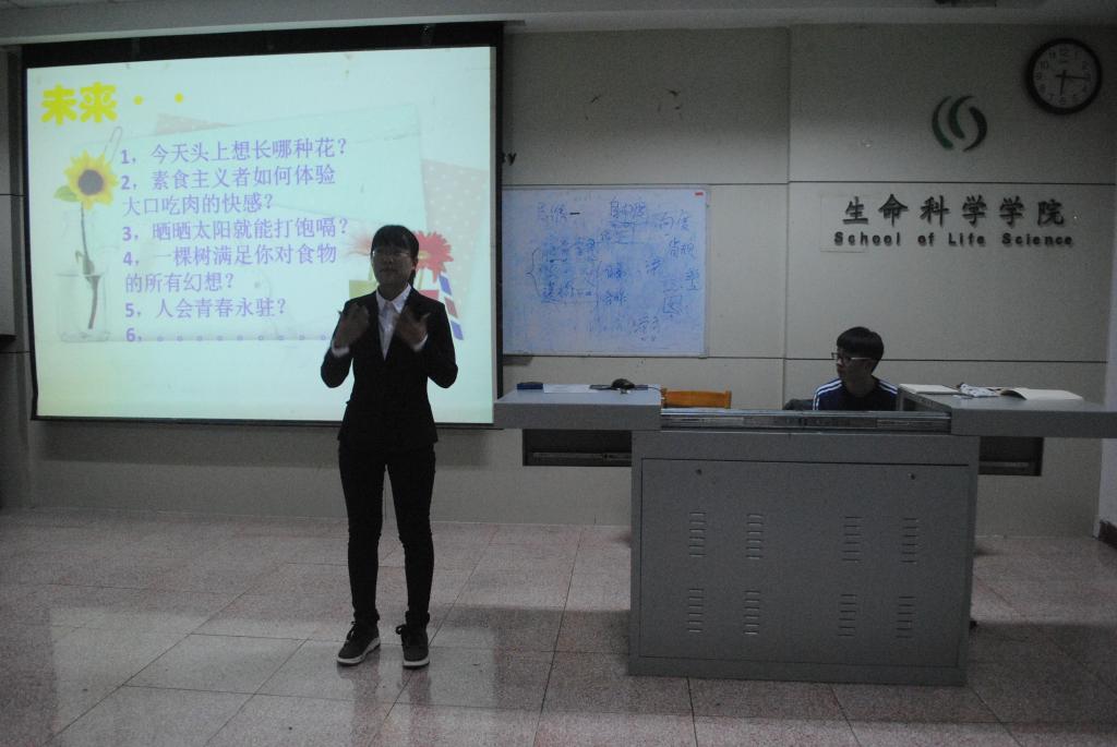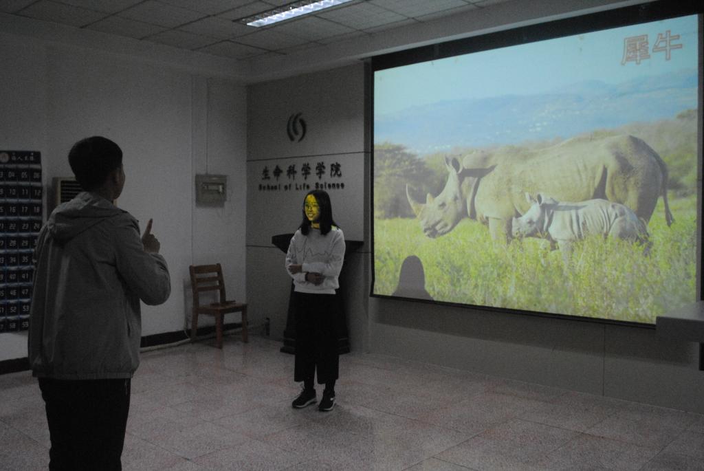 比赛伊始, 首先由参赛选手抽签决定自己的出场顺序,然后采取PPT等方式对绘制作品的创作理念、过程等进行了讲解,选手们选取的题材千变万化,有花的世界、神秘的大脑、可爱的小动物、萌萌的植物等等。讲解风格也是灵活多样,这其中包含着选手大胆的想像,选手们的生动讲解充分体现了“绘出专业特色,畅想生物未来”的主题;第二环节进行了“你划我猜”活动,两人其中一人比划屏幕上展示的动物或植物名称,另一人猜测,该环节使活动现场气氛变得更加活跃,同学们脑洞大开为队友尽力描述所猜内容,逗的观众哈哈大笑。