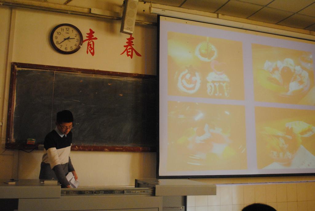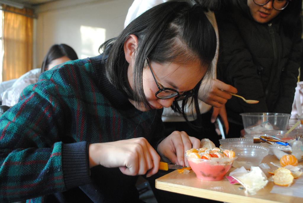 活动首先通过PPT幻灯片向参赛选手讲解果冻制作步骤,宣传健康与营养这一主题,然后下发活动材料供参赛选手制作。参赛选手以小组为单位,每组三人,在两个小时的活动时间内各个选手分工合作制作果冻,在此期间选手自由发挥,通过创新添加材料以展示自己的独特创意。其中,有的同学想到了可食用颜料来为果冻增色,更有同学选用了奶油,水果,彩色糖果,小饼干等来装饰自己的作品。同学们有的将水果融进果冻,有的定在果冻内部,有的则在果冻外边以水果摆出各种精致美观的图案。果冻制成并冷凝后,由观众品尝。