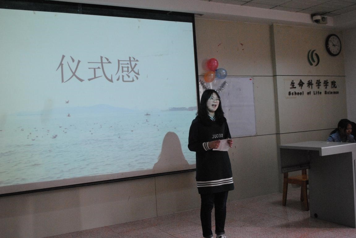 本次活动分为两大部分:文学性的演讲和技术性的手工削苹果皮。首先选手依次上台进行演讲,同时可以配以放映自己制作的PPT或播放配乐。在此环节,参赛选手全都精神饱满,感情丰富。展现出生科学子独有的风采。随后,由另一部分选手进行削苹果皮比赛,限时一分钟,谁削的苹果皮最长可获得适当的加分。参赛选手小心翼翼,可现场还是趣味横生。使各位评委和观众替他们捏一把汗的同时也获得许多乐趣。最后综合得分选出优胜者。本次活动更有意义的则是参赛选手将赛前准备的写给一年后自己的信,交由女生部保管,一年后的女生节由女生部寄还。至此,活动落下帷幕。