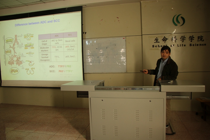 季红斌研究员在对肺癌发生、发展及转移过程中的分子机理以及肺癌的可塑性与药物耐受机制两个方面作了讲解。报告认为,肺癌具有非常强的可塑性。这种可塑性不仅仅是导致肺癌恶性进展及转移的罪魁祸首,而更为重要的是,它是导致临床治疗失败的主要因素。靶向EGFR突变体的个体化治疗是肺癌临床治疗中的一个巨大成功,是一个里程碑事件。然而,细胞表型转变(由腺癌转变为小细胞肺癌)以及肿瘤细胞内的分子重编程往往会导致耐药的产生。季红斌研究员关于肺腺鳞癌转分化的研究工作,提示这种病理类型的转变可能代表了肺癌耐药的一种新机制。