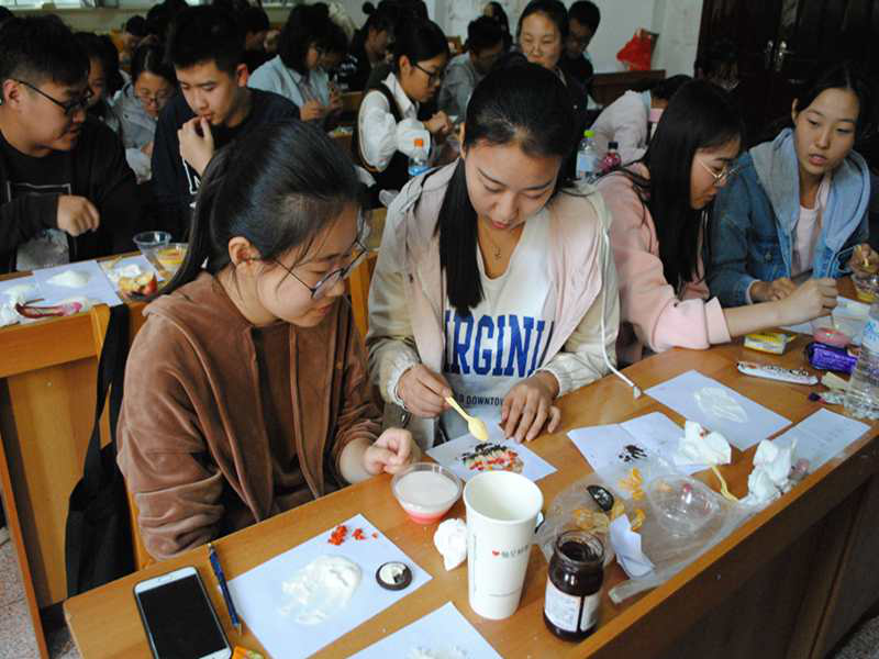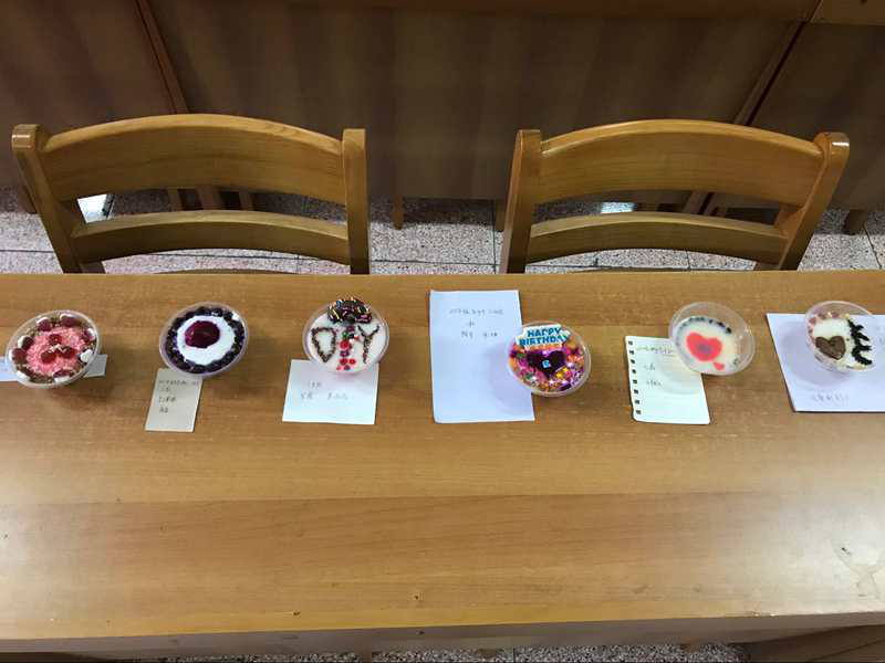 本身的研究教学方向出发,向参赛者展示了某些食品添加剂安全事件,并从专业的角度告诉参赛者如何正确认识和使用食品添加剂。在讲解了果冻制作过程之后,各队参赛选手便以小组为单位按照次序取得举办方事先准备好的布丁粉和热水开始制作。在基础制作之上,各组参赛选手别出心裁,分别将自己所带的巧克力,糖果,饼干等作为装饰品点缀在果冻上,使其变得更加美观。最终等待果冻成型后交由评委观赏品尝并给其打分。最终选出各类奖项,并分发小奖品。