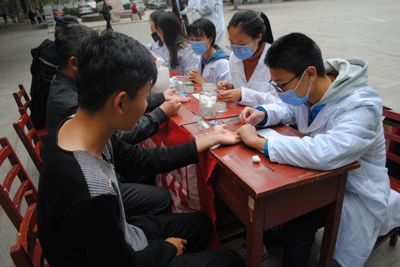为了更好的服务大家,志愿者们都经过了严格的培训。测量现场桌椅,血压计和测血型的工具都摆放得十分整齐。活动开展不久,便吸引了很多人驻足停留。志愿者们消毒、采取血样、滴定血清等,有条不紊地为过往的师生测量血型。志愿者们也认真地为师生们测量血压,并耐心为其讲解血压有关知识,并给大家提出了一些健康的小常识。最后将所测情况汇总,完成了一个血型血压的小调查。现场气氛十分热情,丝毫不见秋天带来的寒冷。