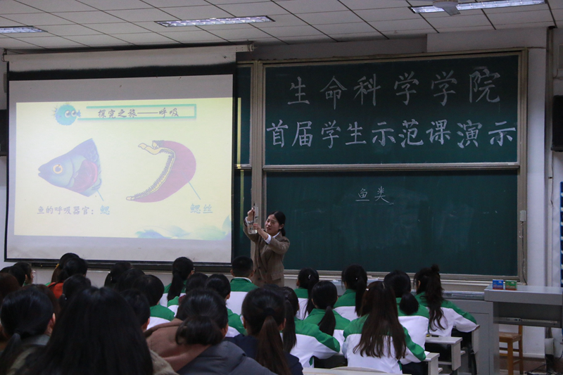 团委选择了在从业技能大赛中获得过特等奖、一等奖、二等奖的同学做授课展演。首先是岳淑婷同学,她讲解的是光合作用,洪亮的声音,简洁的语言,漂亮的板书,无不显示出她授课的规范性。接下来,由张飘飘同学做展演,她讲解的是转录,她凭借平易近人的姿态征服了现场的同学。张祥沛老师对这两位同学进行点评展演:两位同学技能精湛,内容精细,教学设计、理念新颖;同时对两位同学的不足提出了改进意见。而后,王美云同学和杨丽娟同学分别就鱼类和磷脂双分子层为大家做了授课展演,充分展示了她们扎实的专业技能与别样的授课风采。郭永峰老师分享了自己对授课大赛的理解并对两位同学进行点评展演。