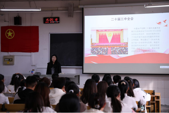 范晓慈以《以中国式现代化全面推进中华民族伟大复兴》为主题,介绍了党的二十届三中全会的主要内容、中国式现代化的历史进程,呼吁同学们以黄文秀等青年先锋为榜样,踔厉奋发向未来。