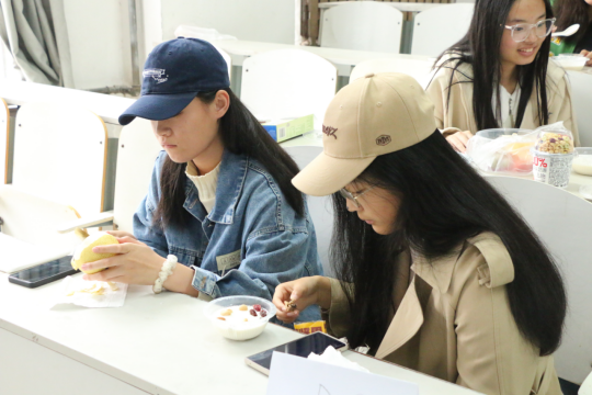 第二天,同学们再次来到综合楼106。这一次,他们要利用水果、饼干、桂花等材料对自己制作的酸奶进行创意装饰。现场气氛和谐而热烈,同学们的创意层出不穷,充分展现了捷克论坛