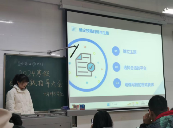 活动伊始,由主持人介绍本次活动相关背景。随后,由社会实践部副部长详细地介绍了社会实践活动的流程,其中包括组建团队、确立主题、中青网报名,制定计划、开展实践活动,撰写实践报告、答辩和评选等环节,让同学们对如何开展实践活动有了进一步了解。接着,由青鸟计划“先进个人”对青鸟计划的计划相关内容展开描述,使同学们对"青鸟计划"这一代表性实践活动有了更加全面的认识,提高了同学们对参与社会实践活动的积极性。最后,由优秀队长分享实践经验,向新生讲解了撰稿、投稿的方法技巧等方面内容。此次大会总结的经验技巧有效的帮助新生解决实践过程中可能面临的困难,对寒假实践活动提供了宝贵经验。