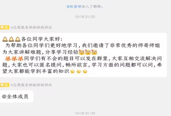帮扶活动以线下线上相结合方式展开,以学业帮扶交流群聊为纽带,实现师哥师姐针对性帮扶,“有问题直接问,不拖延现解决”使学习更有效率,群聊也成为大家在交流中共同进步的重要平台。同学们在群聊中踊跃发言,各师哥师姐也积极解惑。