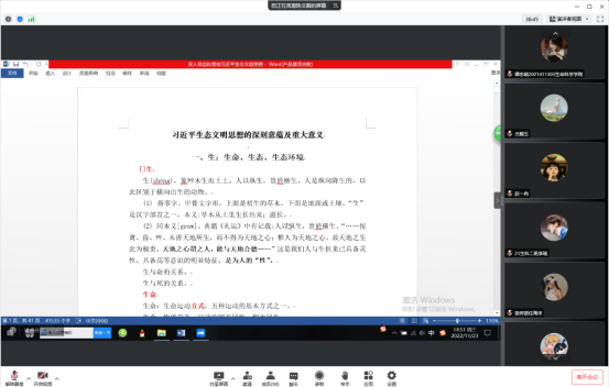 课程伊始,陈文殿老师先从农业文明与工业文明的冲突为出发点引出我国生态问题产生的原因。随后,陈文殿老师从生态问题的根源及反思批判、马克思恩格斯的生态文明思想等方面详细阐释了习近平生态文明思想的深刻意蕴和价值意义,深刻论述生态文明与人类存续、社会可持续发展的紧密联系,号召青马学员认真学习习近平生态文明思想,以实际行动筑牢国家生态保护防线。最后,刘文静对课程进行总结,进一步对学员们提出了期望与要求。整场报告角度新颖独特,在知识上深入浅出,在精神上深刻论述,各位学员认真学习,积极思考,对国家生态文明建设发展及现状有了更加清晰地认识。