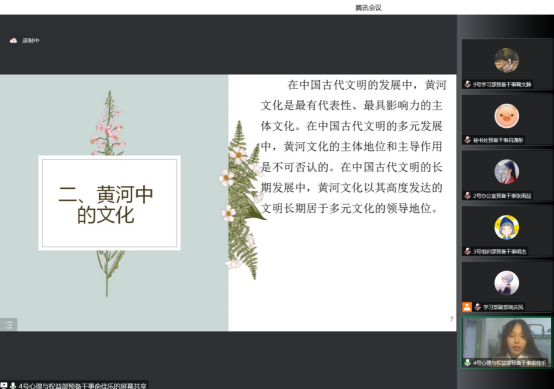 会上大家充分交流了各自对黄河文化和生态文明的深刻认识,分享主题包括黄河文化背景介绍、如何做好生态保护及黄河治理、治理黄河的意义、国家对于治理黄河的策略等。现场同学们各抒己见、讨论热烈。同学们都认为学习黄河文化、共同建设生态文明家园是我们共同的责任,要勇担青春之责,为家园贡献自己的力量。