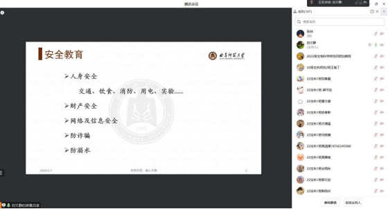 辅导员从交通安全、人身安全、财产安全、乘车安全、防溺水、防诈骗等方面展开,引导同学们树立安全观念,提高安全防范能力,预防和杜绝各类事故的发生。