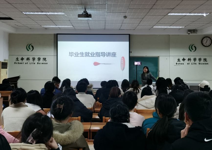 在生物楼232教室举办2023届毕业生就业指导讲座。就业指导中心主任石璐、毕业班辅导员赵连栋和张慧芳、2023届本科毕业生参会。