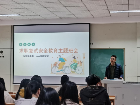 辅导员赵连栋从求职和复试两方面强调了安全教育的重要性及学校的相关要求,通过详细的案例讲解,提醒同学们掌握求职中的安全应对策略。在复试方面,提醒大家注意往返途中的行路安全,保护好个人财产,同时注意网络安全,保护好个人信息。