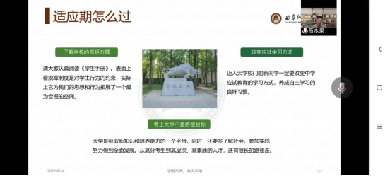 2021级生态学博士研究生商永泉带来《追逐梦想,扬帆起航》专题经验分享,2022级辅导员及2022级生态学全体学生参会,会议由张帅老师主持。