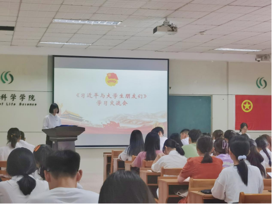 本次学习交流会在铿锵有力的国歌声中拉开帷幕。随后,同学们共同观看了《习近平与大学生朋友们》时政微纪录,纪录片讲述了习近平总书记与青年学生交流的点点滴滴。习近平总书记对青年学生们寄予厚望:“愿青年们牢记党的教诲,不负时代、不负韶华、不负人民,在青春的赛道上奋力奔跑,跑出这代人最好的成绩。”观看完视频后,感动之余,同学们对自己身上所肩负的责任与使命有了更加清晰的认识。最后,学生代表陈炳兆、赵一冉分享了他们的学习心得。他们提到,经过学习后,习近平总书记亲和、诚挚、处处为人民着想的形象在他们心中更加生动,他们也更加坚定了把青春与祖国的前途和命运紧密相连的决心。