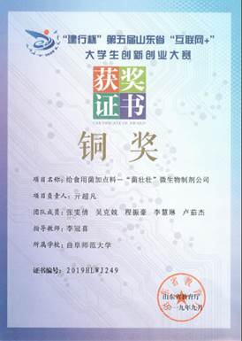 等省直部门单位共同主办,中国建设银行股份有限公司山东省分行和山东教育电视台协办,参赛作品包括创业计划书、产品介绍视频及路演PPT,历时3个月的时间,全省共有136所本专科院校、7.4万支队伍、28万名大学生参赛。其中我校一千多支队伍参赛,27支推荐进入省赛,8支经过省级初评最后2支进入决赛,并斩获铜奖。