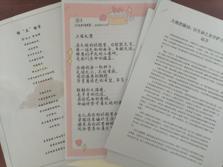 活动伊始,参赛学生报名活动并进行参赛作品的书写,表达自己对土壤保护的看法,同时内容涉及专业知识,展现土壤保护的重要性。活动当日,参赛者将自己的作品提交至生物楼一楼大厅的展示区,参赛同学在作品中巧妙融入“土壤”相关元素,从多角度、多层面书写土壤的价值、现状与保护意义,展示人与自然的和谐关系。随后,评委进行公开评审与投票,评选出优秀作品若干。