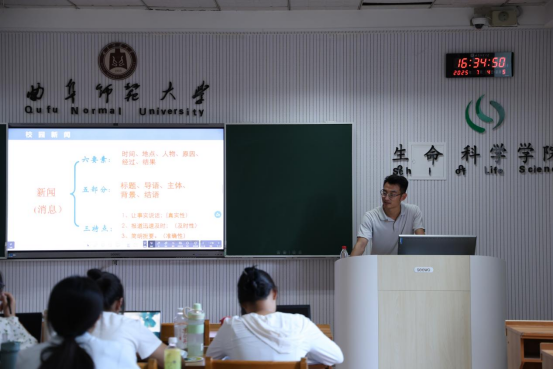 赵连栋老师对新闻稿撰写要点进行了系统细致地讲解。他围绕新闻的“六要素”“五部分”及“三特点”展开讲解,结合活动类、会议类等常用新闻实例,展示了优秀范文模板,为同学们提供直观学习样本。赵连栋老师着重强调了新闻稿的格式规范,对标题、正文、落款的字体、字号、颜色,以及段落间距等细节都作出了明确要求;指出新闻配图需布局规范清晰,不同排版版式的优缺点与适用场景。他强调,新闻稿件的编发需严格执行”三审三校“制度,撰稿的质量决定了新闻质量,必须进行严谨的整理、审核和校对,确保稿件保质保量。