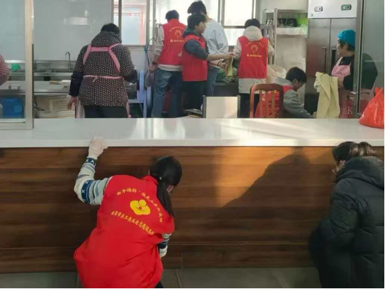 活动中,志愿者们身着红色志愿马甲,按区域分工协作。有的手持消毒湿巾细致擦拭餐桌椅的桌面、桌腿及椅面,有的将零散桌椅逐一归位,为老年群体留出宽敞通行空间。后厨外的取餐台沿也被逐一擦拭,保障就餐区域卫生无死角。经过两个小时的努力,食堂就餐区桌椅整齐、地面洁净、窗明几净,取餐台及卫生死角均清理到位,顺利完成餐前准备,为当日30余名就餐老人营造了清爽舒适的用餐环境。此次志愿行动的细致服务,得到了食堂工作人员及老年群众的一致好评。