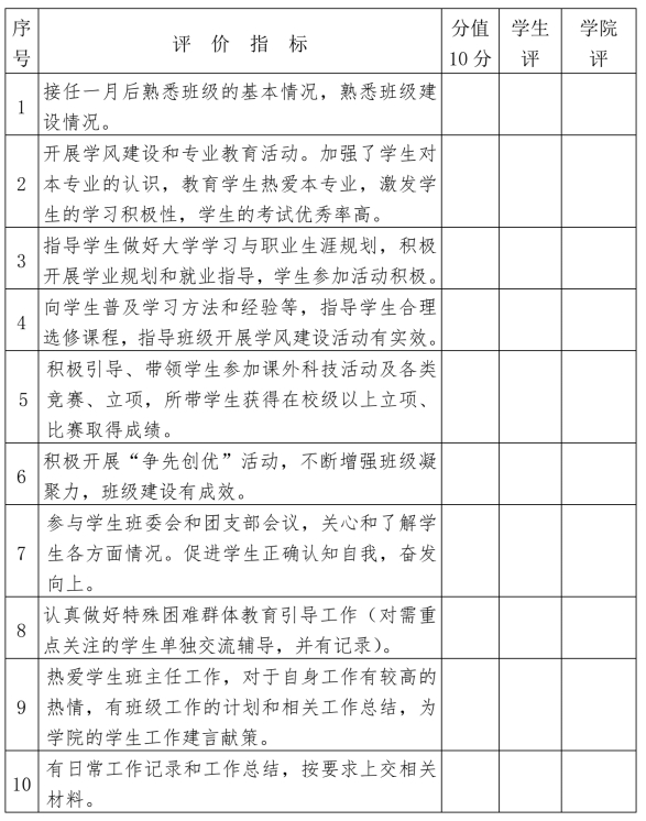 对班主任每学期考核一次,每学年进行一次评定。两个学期的考核结果的平均值为年度考核结果。