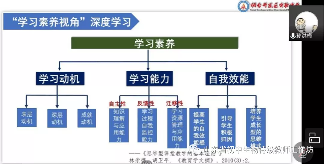 烟台市特级教师工作坊主持人孙洪梅介绍“双减背景下生物学教学中的深度学习”。孙老师通过对深度学习的概念、要求、内容等维度的介绍,使与会师生对深度学习在各视角的重要作用有了更加深刻的理解,通过介绍双减背景下深度学习的机遇与挑战,提出在生物学教学中开展深度学习的相关举措。