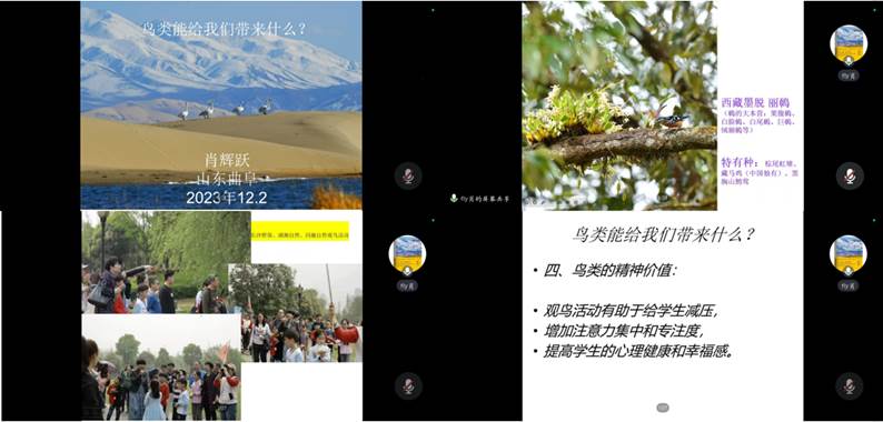肖辉跃老师结合多年经验进行了题为《鸟类能给我们带来什么》的报告。肖老师借助生动丰富的观鸟图,引领我们深入探索了鸟类对人类社会和生态系统的多重价值。从观赏价值、生态价值到经济价值和精神价值,每一幅图都犹如一道亮丽的风景线,不仅让老师们领略到鸟类世界的独特魅力,还极大地丰富了生物学教学和实践活动内容。